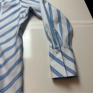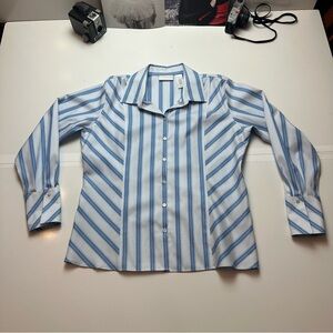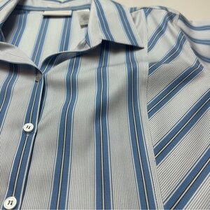 Crisp blue and white striped button-down by Liz Claiborne. Classic tailored silhouette in breathable 100% cotton — polished enough for office wear, relaxed enough for everyday styling.