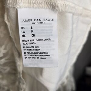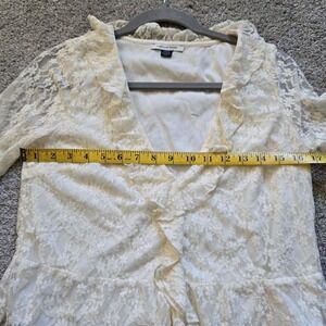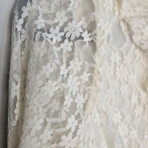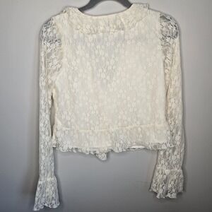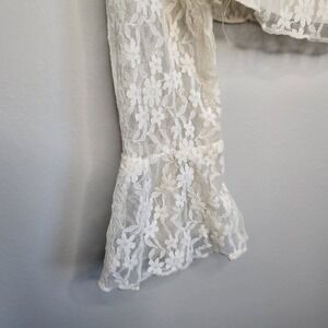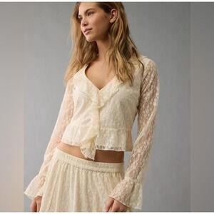 This American Eagle Women's Small Lace Blouse in ivory/cream color exudes a whimsical, feminine, and flirty vibe, perfect for those embracing the angelcore or fairy aesthetic. With a v-neckline, long bell sleeves, and ruffle accents, this blouse adds a touch of elegance and romance to any outfit. Made from a nylon blend lace fabric, this sheer top is versatile and can be styled for various occasions, from casual to special events. Perfect for those who appreciate a blend of comfort and charm in their fashion choices.