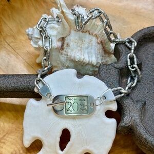 Where vintage charm meets modern elegance. A vintage-inspired hotel key tag engraved with “Room 20 – Hotel New York” adds a distinctive, storytelling detail. A piece for the woman who appreciates refined details, subtle drama, and jewelry with character. Matching bracelet listed ad well