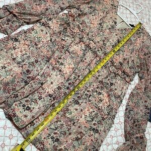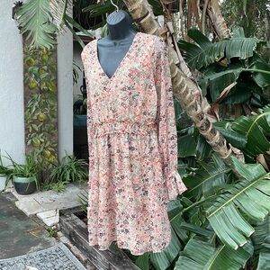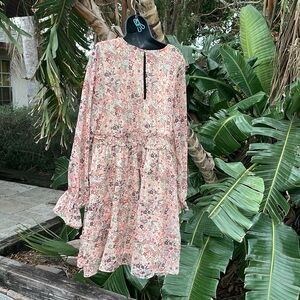 A pretty wildflower floral on a cream background with a slight gold iridescent thread, running through it. We start with some semi sheer puff sleeves, ending in a ruffle a V-neck to a ruffled tiered skirt. The chiffon over is sheer, but the dress is lined, except for the sleeves and excellent condition.