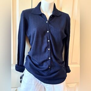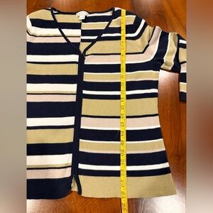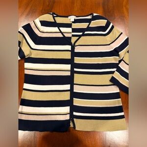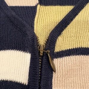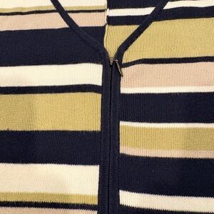 Good condition, zipper down, quality knit, Chic striped cardigan with a V-neck design. Features navy, olive, and cream stripes. Perfect for casual wear.