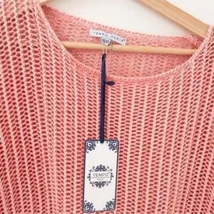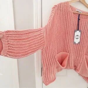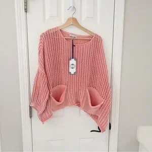 Chic coral knit sweater. Features stylish front pockets. Ideal for layering.