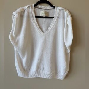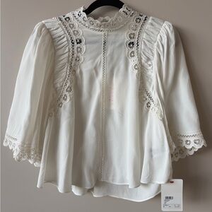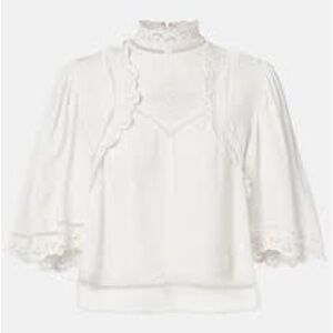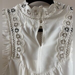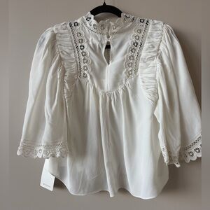 Elegant white blouse with lace detailing. Features pleated shoulders and scalloped edges. Perfect for a chic look.
