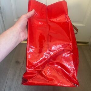Stylish red tote bag with tan handles, perfect for everyday use. Add a pop of color to your outfit with this versatile accessory.