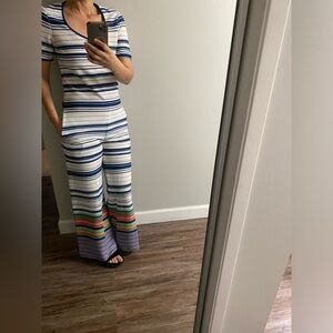 Stylish vintage 70s, possible homesewn jumpsuit featuring a vibrant striped pattern. Includes shades of blue, green, red, yellow, and cream. Has pockets! Ptp 16, waist 15, hips 19, inseam 28, length 55.5