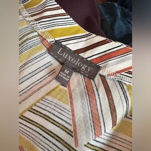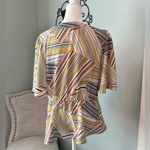 Yellow brown abstract stripe print peplum faux wrap shirt top with wooden buttons