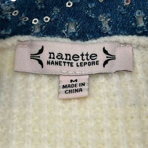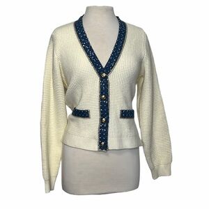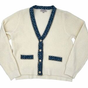 Nanette Lepore Waffle Knit Cardigan Medium Cream Tweed Denim Floral Trim Preppy