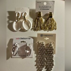 Choose from four beautiful pairs of earrings for one great price!!!!Brands include Sugarfix Baublebar and Liz Claiborne. Chic earring set featuring gold tassel, silver hoops, and white hoops. Perfect for any occasion.