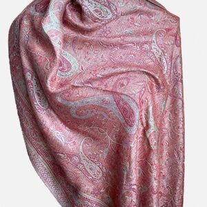 Enhance your style with this elegant paisley scarf. Featuring a beautiful blend of pink and gold, this accessory adds a touch of sophistication to any outfit.