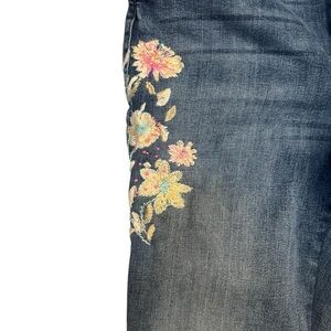 Mid rise, straight leg, zip fly, 5 pocket styling, embroidered floral detail on left leg, slight whiskering, stretch denim