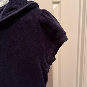 Bundle - Terry cloth navy blue short sleeve hoodie with very slightly puffed shoulder and pockets Features a stylish Juicy Couture charm zipper and soft texture in a girls size XL 14-26. Capri Pants have a drawstring waistband and wide legs in women’s M.