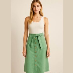 J.Crew Re-Imagined linen blend button-front midi skirt in a vibrant green. Features a flattering A-line silhouette, functional front buttons, removable tie waist belt, belt loops, and a large front patch pocket. Fully lined for comfort.
