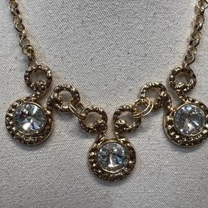 This striking necklace features three round faceted clear crystals framed in gold-tone textured medallions, connected by bold chain links for a sculptural finish. Adjustable lobster clasp closure ensures a comfortable fit.