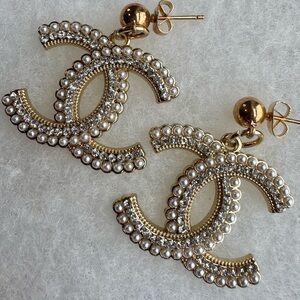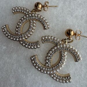 NEW Luxurious CHANEL earrings with gold and white pearl accents. Ideal for a sophisticated look.