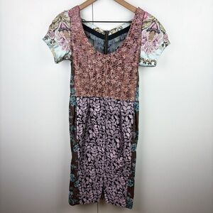 Anthropologie Beguile Byron Lars lasercut tapestry pieced brocade dress. Short sleeve, sheath pencil knee length, zip front. Multi color textured embroidered jacquard mesh mixed panels in blue cream pink brown colors. Great formal event party evening wedding guest bridal shower cocktail vacation resort wear.