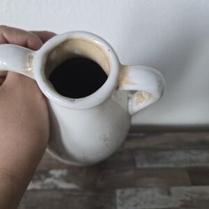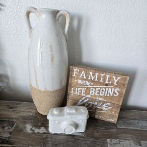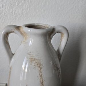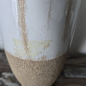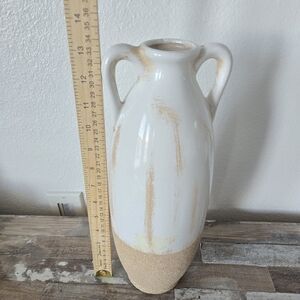Elegant vase with dual handles. Smooth white finish. Textured tan base. Perfect for home decor.Hobby Lobby White and Tan Vase it have a little stain but you cant tell.(ONLY VASE)review pictures for condicions and mesurements.shipping next-day!!