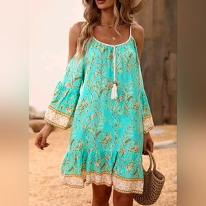 New Boho Coastal Floral Open Shoulder Mini Dress Turquoise Blue Green Tan