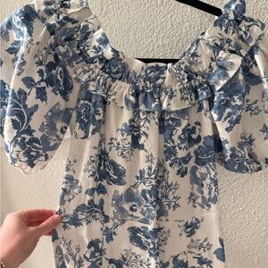 Chic off-shoulder dress with back zip and front slit. Blue floral design. Linen. Worn once. Excellent condition. No flaws. Reference photos for like new condition