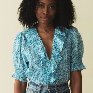 gingham cherry print. It is a cropped, pullover-style blouse made from cotton, featuring a voluminous ruffled neckline and puff sleeves. Excellent condition. No flaws.