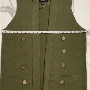 Elevate your style with this classic olive green sleeveless sweater vest. Very stylish with bronze buttons and split side seams. Perfect for layering, this versatile piece adds a touch of elegance to your fall outfits.