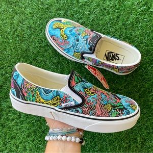 Vibrant slip-on sneakers with a multicolor abstract design. Features a white sole and black trim. Perfect for casual wear.