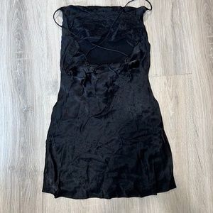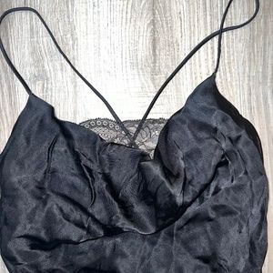 cowl neck and cowl back satin slinky black dress with lace bralette