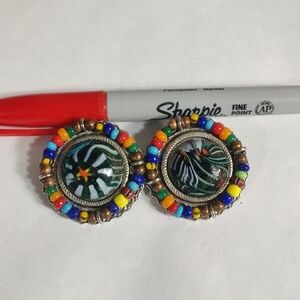 Robert Rose Beaded Clip Earrings Art Glass Cabochon Statement Vintage