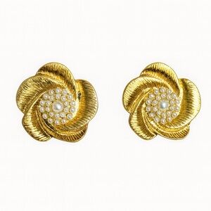 Chic gold earrings with a floral design. Pearl accents add elegance. Perfect for any occasion.