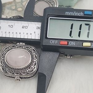 Beautiful vintage-inspired rose quartz jewelry featuring ornate silver-tone filigree detailing. Each piece showcases soft blush-pink rose quartz with a gentle, romantic glow. The locket opens and closes securely, making it both decorative and functional.
