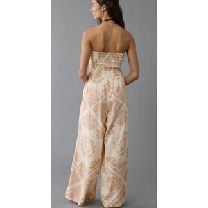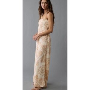 American Eagle Bella Strapless Jumpsuit Cream Pink Boho Smocked Wide Leg