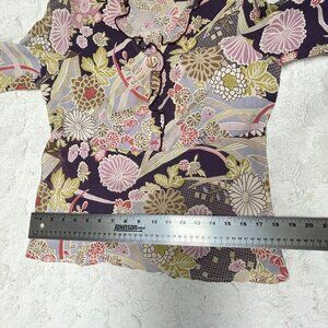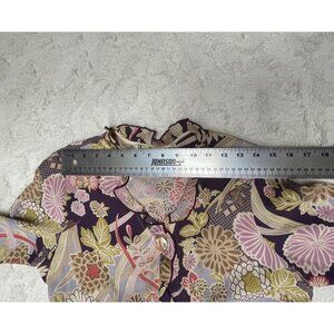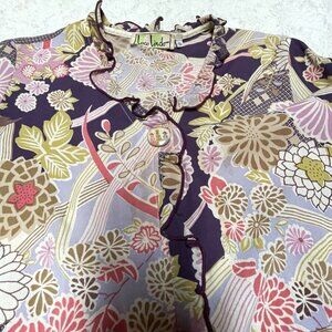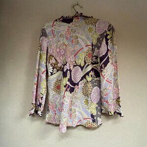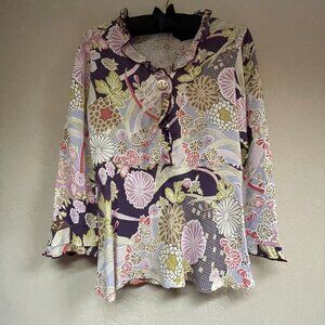 Beautiful long flared sleeve button up popover blouse. Has ruffle detail around neck. Single button on neck have cute unique print. Has multicolor floral pattern allover, lightweight and very pleasant to wear.