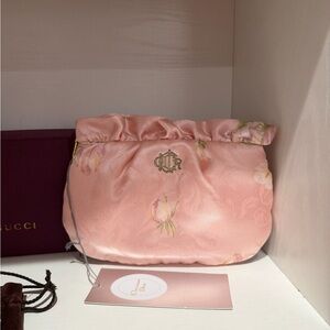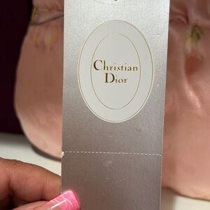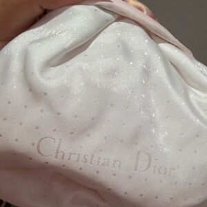 Chic Dior cosmetic bag in soft pink satin. Features delicate floral pattern. Perfect for elegant storage.