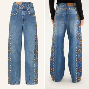 From Farm Rio: Crafted from soft blue denim, they feature a relaxed straight-leg silhouette with striking metal stud accents tracing the front pockets and side seams. The standout embroidered floral motifs in rich blues and warm browns add a playful, artisan touch along the sides, blending nature-inspired beauty with bold modernity. A perfect harmony of comfort and statement-making style.