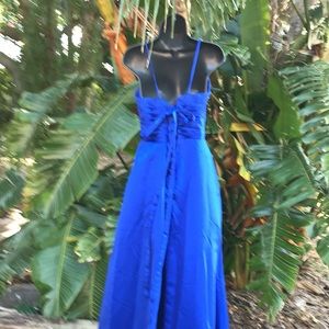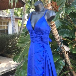 This beautiful gown is a deep periwinkle blue. Spaghetti straps and some deep cut bodice with some boned and padded cups. The worst sinus rushed. There is a beautiful crisscross tie back making the dress adjustable this skirt is A cross between a call I’m in an airline with a very high upper thigh slit at the side from the side of that slipped to the back is a fairly long train. Dresses amor constructed piece fully lined and an excellent condition there are no size tags but based on my measurements and the fact that it’s adjustable with ties at the back I will List as a Size 2 adjustable to a four. In excellent condition there’s going to be a steaming necessary for a few wrinkles