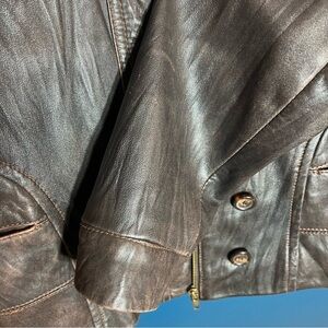 Chic brown leather jacket with a sleek design. Ideal for a sophisticated look. Under arm rip and lots of wear. Also has a bit of a wood smell since owner had a wood stove