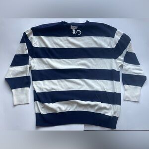 Stylish crewneck sweater with bold navy and cream stripes. Perfect for casual wear.