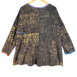Whimsical tunic top featuring an eye-catching Egyptian-inspired print. This unique top boasts a V-neckline with colorful button closures and vibrant trim detailing at the cuffs. The top is designed with a relaxed, comfortable fit and side slits for ease of movement.