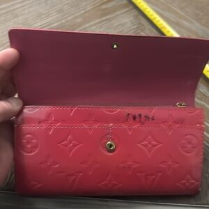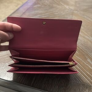 Chic coral wallet with signature monogram. Stylish design with gold button detail.