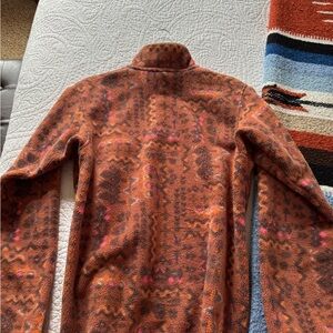 Warm fleece pullover with a unique pattern. Features a chest pocket and button-up collar.