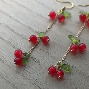 These exquisite cherry earrings feature a cascading design with vibrant red beads and elegant gold accents. The playful movement of the beads adds a touch of whimsy, making them a standout accessory for any occasion.