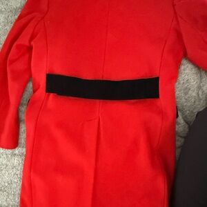 Chic red trench coat by Rothschild. Features bold black accents and double-breasted design. Perfect for stylish outings.