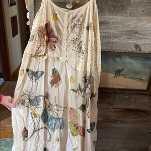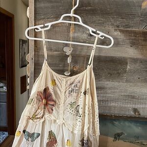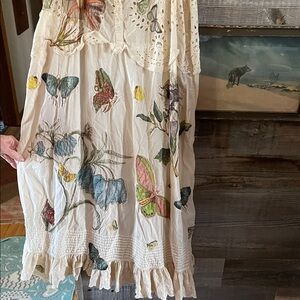 Elegant cream dress with vibrant floral design. Features colorful flowers and butterflies. Perfect for a bohemian look.
