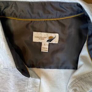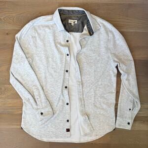 Fundamental Coast Andy Knit Shirt Soft Stretch White Gray Mens Size Large. Polyester-rayon-spandex blend. Super soft, has stretch and so comfortable. Full button closure. Curved hem. Heathered light gray/ white. Relaxed fit. $115 retail. Excellent condition. Smoke free home. NEXT DAY SHIPPING.