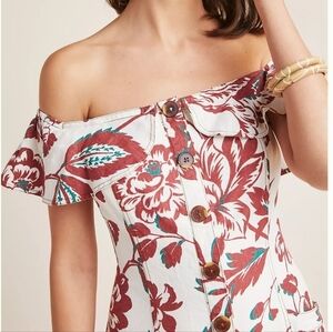 Anthropologie Women's Oahu Dress, Linen Midi Floral Burgundy Buttons Pockets, 0