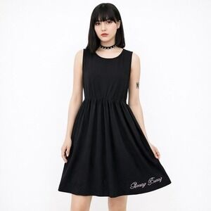 Black gloomy burry babydoll dress with pink embroidery size large 32"L 29" stretchy waist. #goth #coquette #kawaii