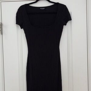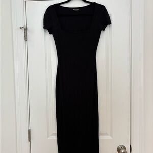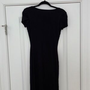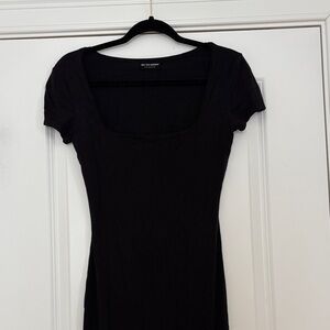 Chic black midi dress with short sleeves. Perfect for versatile styling.