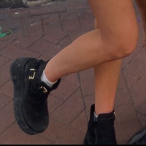 Sleek black platform boots with buckle detail. Perfect for a bold look.