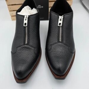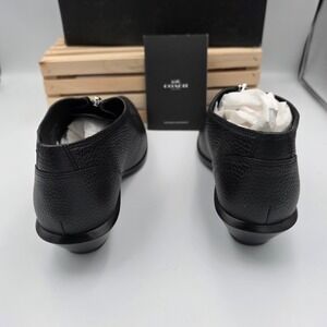 Coach Bandit Zip Shoe in pebbled black leather offers a sophisticated blend of a classic loafer and a modern ankle bootie. These pointed-toe shoes feature a prominent silver-tone front zipper with a branded pull, set against a rich pebbled texture. The low stacked heel and structured silhouette provide a refined look suitable for both professional and casual settings. Crafted with a durable leather upper and a contrasting brown welt, these shoes are designed for lasting style and comfort.