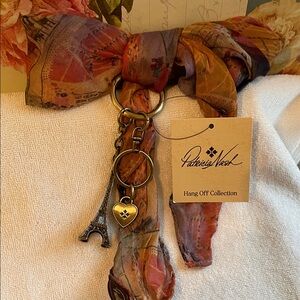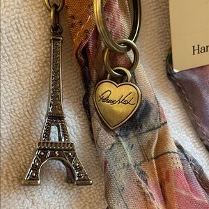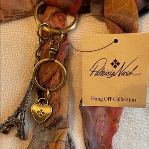 Chic Patricia Nash scarf with the maps of Paris also has a key ring that’s holding two charms one is the Eiffel Tower and the other one is the Patricia Nash heart design, has never been used still has the tag on it. Both are very pretty. You can use it on your purse, use the charms on your purse on your keys. Use the scarf in your hair or on your purse and comes from pet and smoke free home