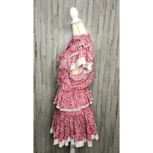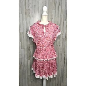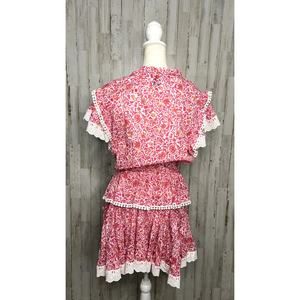 Keywords: MISA Los Angeles dress, Lilian Dress, knee length dress, pink floral dress, women's party dress, cocktail dress, lace dress, short sleeve dress, keyhole neckline, floral print dress, ruffle accents, lace trim, women's fashion, pre-owned dress, dry clean only